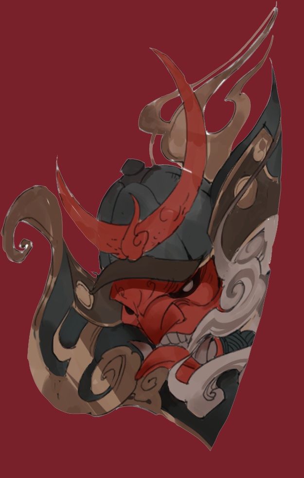偏平面的手法将人物的服饰与配饰做了风格化的处理,加入了火魂的设计,选取鬼面元素作为服装的装饰纹样,
